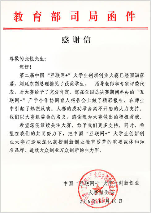 2018年,九游连续多年为中国国际互联网+大学生创新创业大赛做出积极贡献,获教育部来函致谢。